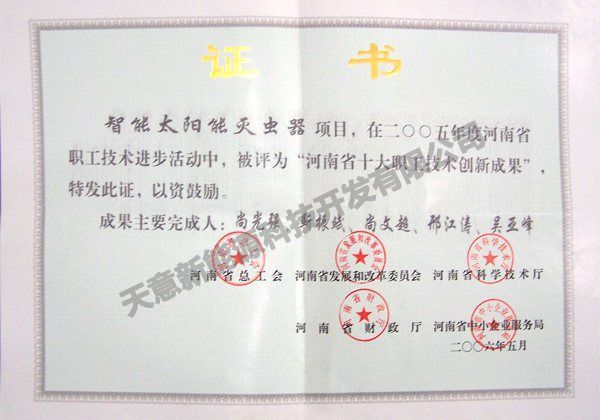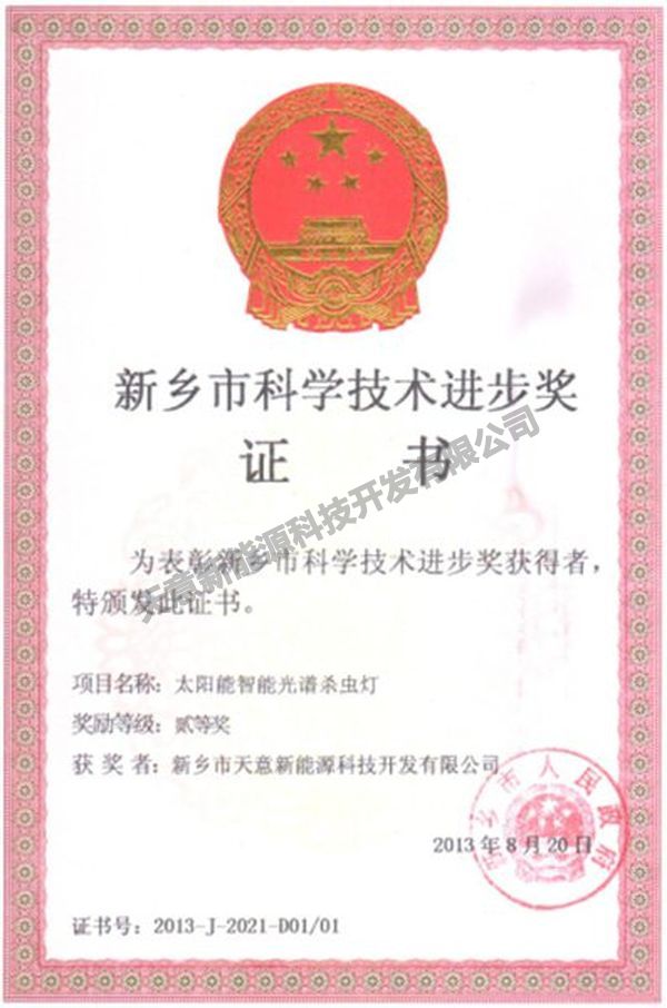 新鄉(xiāng)市天意新能源科技開發(fā)有限公司與中國農(nóng)科院、中國科學(xué)院建立了長期合作關(guān)系。成立了“院士工作站”、“太陽能滅蟲器工程技術(shù)研究中心”國家研發(fā)計劃“病蟲害防治LED應(yīng)用關(guān)鍵技術(shù)研究與示范”課題示范單位等行業(yè)權(quán)威科研機(jī)構(gòu)。